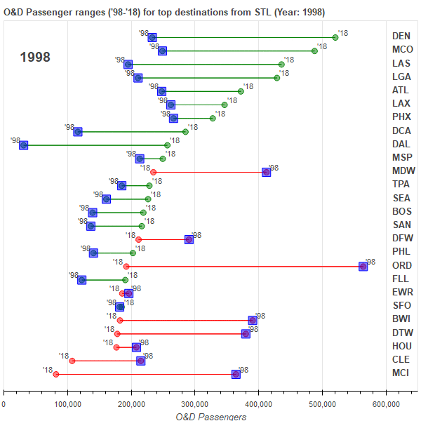 STL's capacity and route network has changed extensively in the past 25 years. In the 90's (and early 2000's) and TWA (and subsequently American) dominated Lambert and the airport saw about twice as many total passenger as the airport saw in 2019, and that network definitely impacted the O&D from STL. Overall many destinations have seen O&D growth, but several generally nearby destinations have seen sharp declines that followed the loss of flights and seat capacity to those nearby cities. While the total O&D growth for Lambert since the 90's is not great when compared to other US airports, some of that is due to the O&D traffic in the 90's being inflated due to the massive TWA capacity and the declines in many market are more a symptom of diminished service as passengers choose alternative methods of travel rather than an actual reduction normalized demand. Hopefully the analysis here has provided a more nuanced understanding of the slow O&D growth at St. Louis. To conclude, I put together a .gif version of the green/red line chart above that shows the progression over time which I've posted below and offers a last unique look at O&D changes from STL the past two decades.